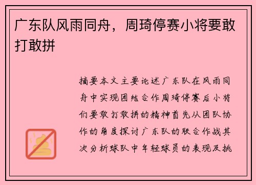 摘要:本文主要论述广东队在风雨同舟中实现团结合作,周琦停赛后小将们要敢打敢拼的精神。首先,从团队协作的角度探讨广东队的联合作战,其次,分析球队中年轻球员的表现及挑战,然后介绍战略部署和球队组织的改变,最后总结广东队风雨同舟,周琦停赛小将要敢打敢拼的重要性和意义。1、团队协作与风雨同舟在CBA联赛中,...